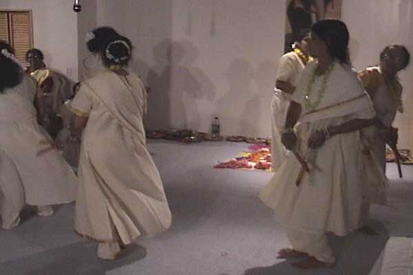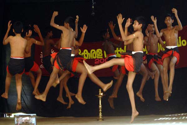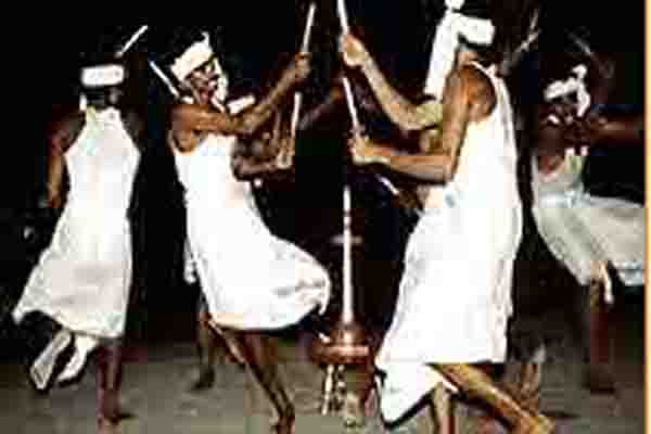 The dancers sing and move in a circle around a nilavilakku as they dance and strike the small sticks in harmony. Though the dancers break away to form various patterns, they keep rhythm with special steps. As the Kolkkali dance progresses, the circle expands and contracts. The pace and rhythm of the dance differs from phase to phase as the accompanying music gradually rises in pitch and the dance culminates.
