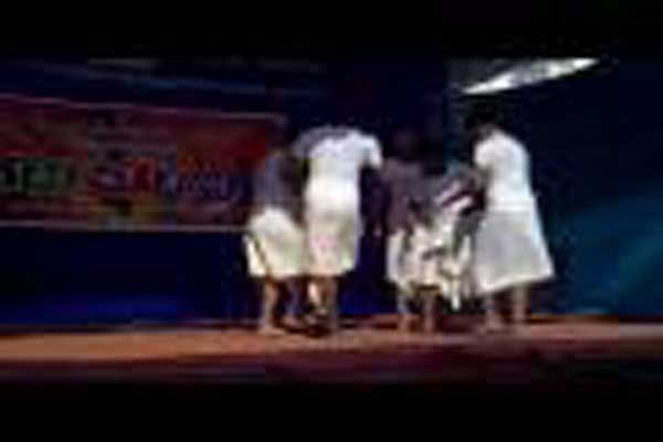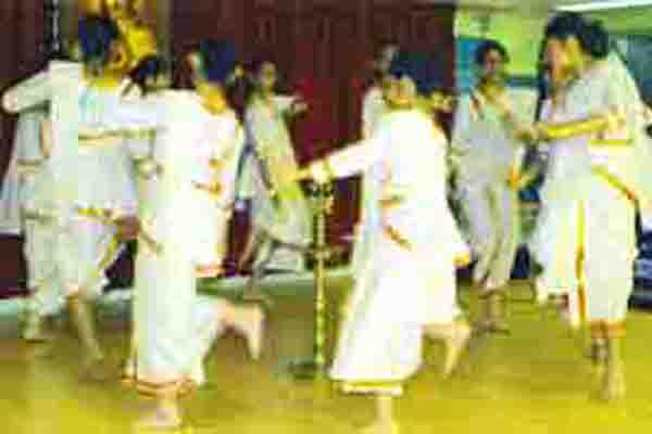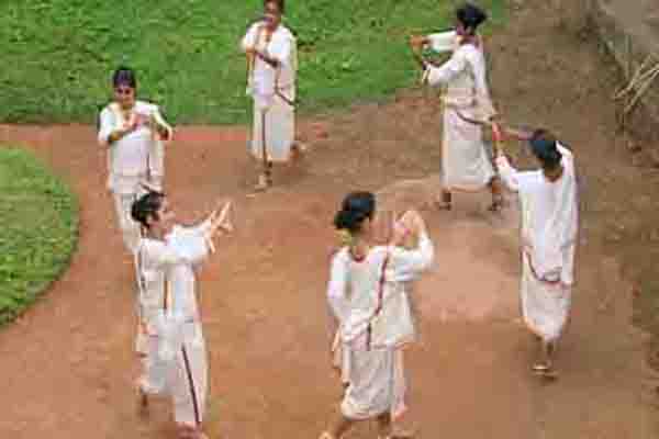 There is a traditional text which accompanies the Margamkali. It is in 14 strophes and has about 450 lines. This song is said to be of a period older than the Portuguese invasion of Kerala. The narration is not accompanied by any musical instrument. This is the song dance part of the art form. The song is sun by the leader of the troupe called the “Asan”. Traditionally the Margamkali was the recreation or activity which helped the Christian soldiers pass time. Recently however, it is almost a compulsory performance in Syriac Christian weddings and such occasions. Traditionally it was an art performed by men only. Nowadays it is also performed by women and on stage and school competitions etc.