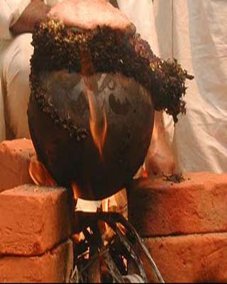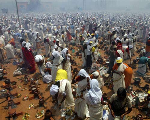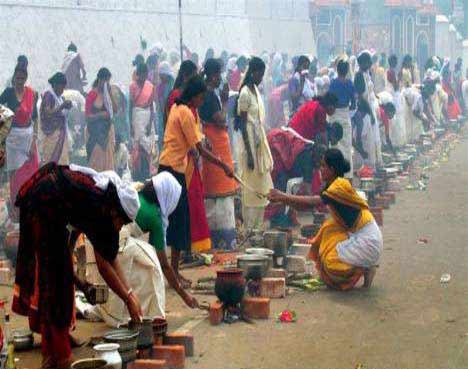 'Pongala' means to boil over. It refers to the customary offering of things which please the deity. It consists of porridge of rice, sweet brown molasses, coconut gratings, nuts and raisins. The ritual of cooking starts early in the morning and by noon, Pongala would be ready. Then the Melsanthi (chief priest) arrives with Devi's sword and bless the ladies by sprinkling holy water and showering flowers. The 'blessed' Pongala is taken back to the house by the ladies. The offering is a type of payasam (sweet Indian dessert), and is offered at the Bhagavathy temples. The payasam tastes delicious, which is one of the main delicacies of this festival, cooked with jaggery, coconut kernel, rice, and plantain fruits. Later, the idol of Devi is carried to Manacaud Sastha Temple in a colorful procession comprising of Thalapoli, Kuthiyottom, Annam, Vahanam, caparisoned elephants etc. Musical ensembles by famous artistes add to the festivities. En route onlookers greet the procession with Nirapara (a measure filled with paddy and decorated with flowers). The procession reaches back, the next morning, marking the end of the festival.From her everything that exists was born to her all things will return. All animate and inanimate are her creations and she sustains them. She has a myriad forms - loving mother, girl, lover, sister, wife and the terrible that can annihilate. It is this Shakti, the great Mother goddess known by countless names, that is worshipped by millions of her representatives on the Earth on Attukal Pongala.