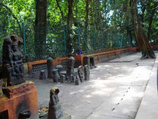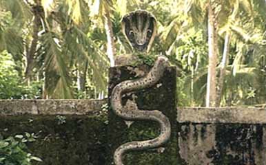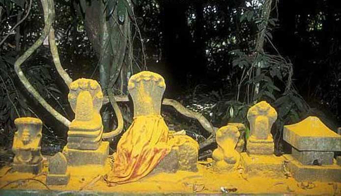 Mannarasala temple is a serpent shrine under the patronage of a brahmin family, headed by a priestess. The ancient shrine is an internationally renowned pilgrim centre dedicated to the Serpent God Nagaraja. Traditionally, Hindu naga snake worshippers had temples in serpant groves. Of these, Mannarsala is the largest with 30,000 images of snake of gods along the path and among trees, and many snakes living around the temple. Sarpa Yakshi and Naga Yakshi are the beloved consorts of Nagaraja. It is believed that Nagaraja as the installed diety is endowed with the form of Hari (Lord Vishnu) and the spirit of Lord Shiva. Legend has it that the first priestess of Mannarasala gave birth to a five-headed snake, which is believed to reside in the ancestral house to safeguard the family. At Mannarasala barren women are believed to be blessed with children and a special turmeric paste available at the shrine is credited with powers to cure even leprosy.